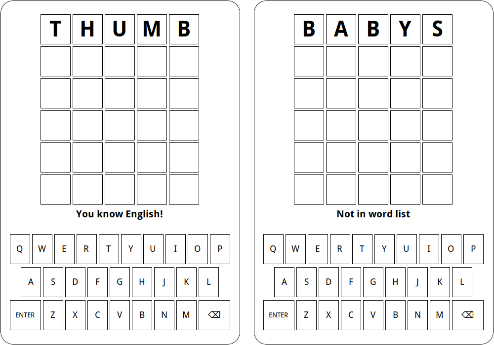 thumb and pressing enter. That word is in the ENGLISH_WORDS sequence, and thus we are congratulated. To the right is the result of typing in babys and pressing enter. Here we are given the same error message as the New York Times uses, which informs us that this word is not in the word list.