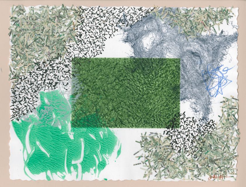 Ink, acrylic, pigment, shredded US currency on Paper