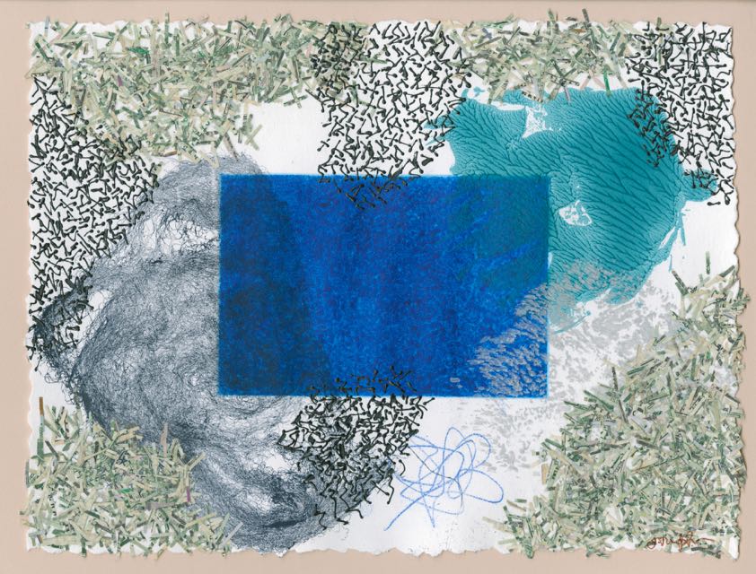 Ink, acrylic, pigment, shredded US currency on Paper