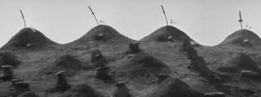 But for a brief shining moment, the two groups--the two social classes--stood together, worked together, cooperated and succeeded in the task before them. The cost was high but at least now a future exists. In 1950s Japan, a past existed and it was a double-edged legacy. There is much in the past about which Japanese could be proud; but there were also things: militarism, colonialism, imperialism, war and wanton destruction of human life, which people had to face. That final image with which the film ends is compelling, isn't it? The four grave mounds on the top of the hill, each with a samurai sword sticking up from it. A reminder of the sacricies made, the costs exacted. Beneath them,are the graves of the villagers. Do these graves somehow stand for all the Japanese who perished in the war, for all that was sacrificed and for all the suffering caused and experienced?